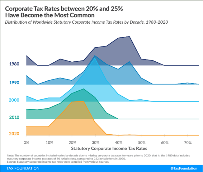Prior to 2017, the statutory corporate income tax rate (state plus federal) in the U.S. was 38.9%, compared to the worldwide average range of 20–25%. Since the 2017 passing of the Tax Cuts and Jobs Act (TCJA), the statutory corporate income tax rate (state plus federal) in the U.S. has dropped 33.67% in value. Now sitting at 25.8%, it is more in line with the worldwide average.